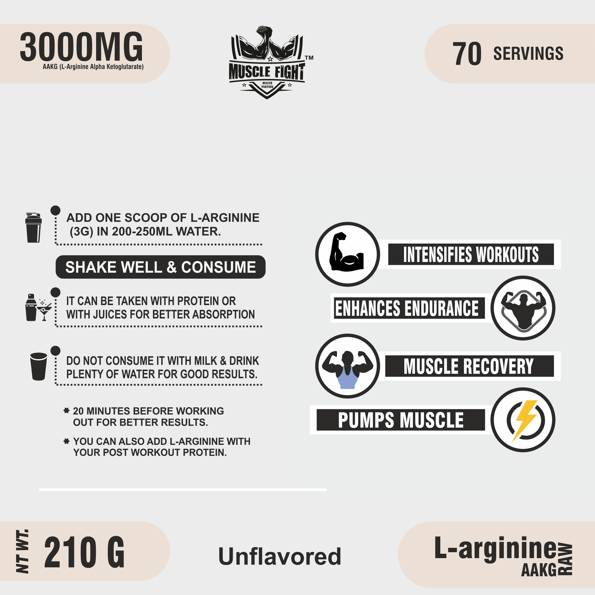 Muscle Fight L-Arginine AAKG Raw is a dietary supplement that contains L-Arginine Alpha-Ketoglutarate (AAKG), a combination of the amino acid L-Arginine and the molecule Alpha-Ketoglutarate. L-Arginine is a conditionally essential amino acid that plays a role in various physiological functions, including protein synthesis, nitric oxide production, and muscle performance. AAKG is often used as a sports supplement to potentially enhance athletic performance, improve blood flow, and support muscle recovery.